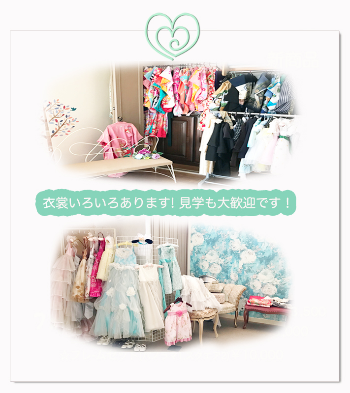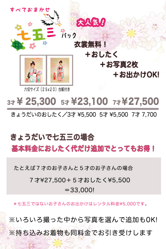 - 持ち込み衣裳/お着付け、ヘアーメイク、七五三パック同額になります。